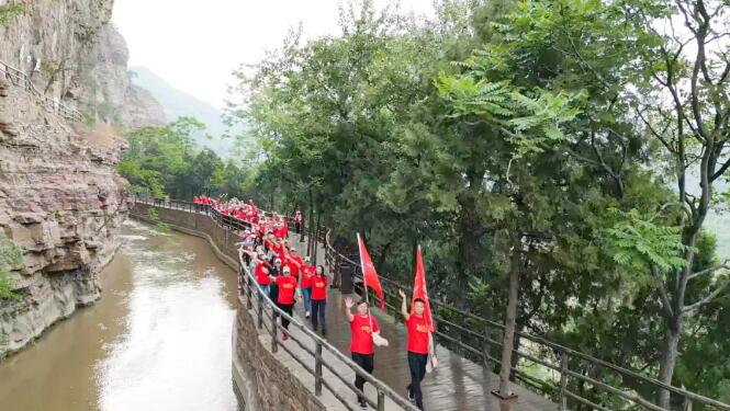 隨后,大家沿著紅飄帶來到了紅旗渠總干渠的咽喉工程——青年洞,通過聽講解、觀實物、看實景、走長渠等,切身實地感受紅旗渠精神的深刻內涵。走在半個世紀前完工的紅旗渠邊,山壁上的一幅幅題字、一幕幕修渠場景次第呈現,每個人都不禁感嘆先輩們“自力更生、艱苦創業、團結協作、無私奉獻”的紅旗渠精神。通過實地的觀摩和學習,大家真切地感受到了林州人民創業的艱苦,加深了對紅旗渠精神的認識和理解,也更加堅定了傳承和發揚這一精神的信念。
